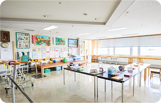(デイケア)心身の機能維持・改善を目的としたリハビリテーションを提供し、在宅での自立した生活が継続できるように支援します。歩行訓練、体操、入浴・排泄介助、住宅改修・福祉用具のアドバイス、必要に応じて併設する木戸クリニックで管理を行います。